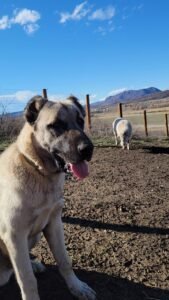 Leona is a 7-month-old Turkish Boz Shepherd, daughter of Princess and granddaughter of MINK. Weighing in at 90 lbs, she’s a sweet-natured young guardian with a calm, people-friendly temperament and a natural instinct for protecting her herd.
